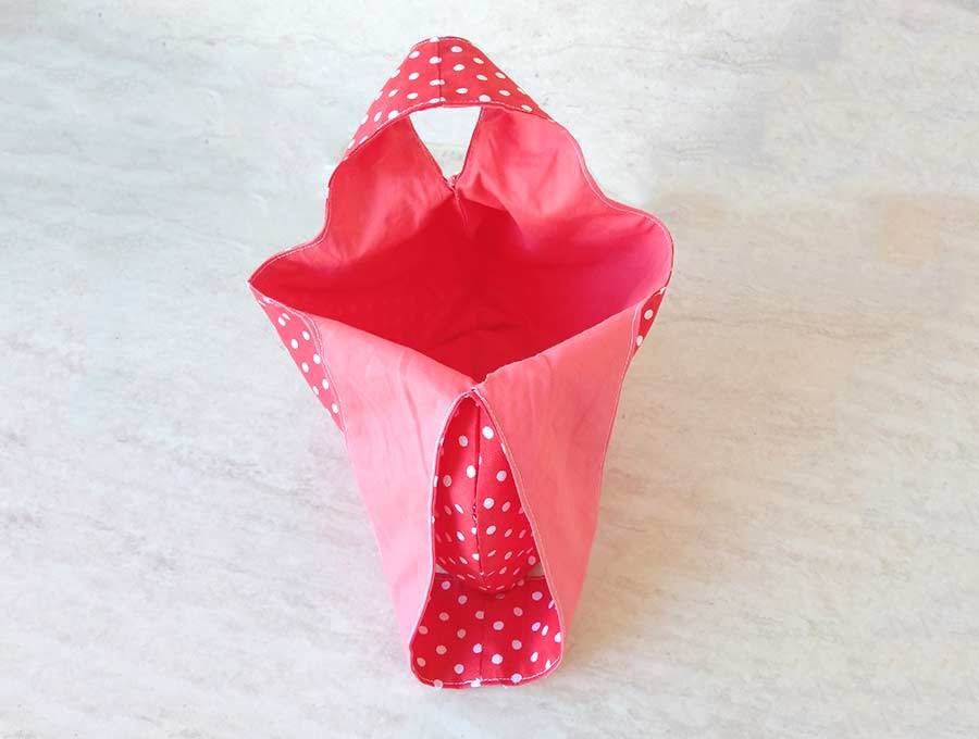 Turn the entire knot bag inside-out through the opening at the handle. You will probably pull one fabric from the other while doing this, so just return them back into each other. Press everything flat.
